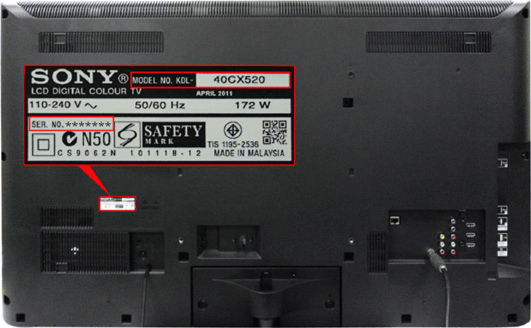 Ein Beispiel für die Rückseite des Sony-Fernsehers, bei dem das Etikett (hervorgehoben) die Modellnummer des Fernsehers zeigt.